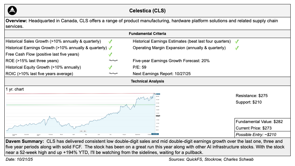 Added Celestica ($CLS) last week to the watchlist. Yes, it’s an AI infrastructure company up +194% YTD. I’m not chasing at these levels, but the company passes my financial strength criteria, so I’ll be patient and wait for a pullback.